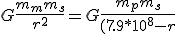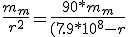 Now if we think about r here, if the ship is between who objects that are only 100m away, we say that if it is 10m from object a, then it must be 90m from object be. Or if the distance equals x from a, then the distance must be 100-x from b. so here we can write that the distance the ship is from the moon be r, and the distance from the planet be 7.9*10^8-r. Therefore we have: