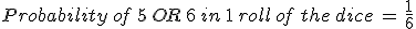 There is 1 5 on a dice and 1 six on a dice. There are two possibilities out of 6